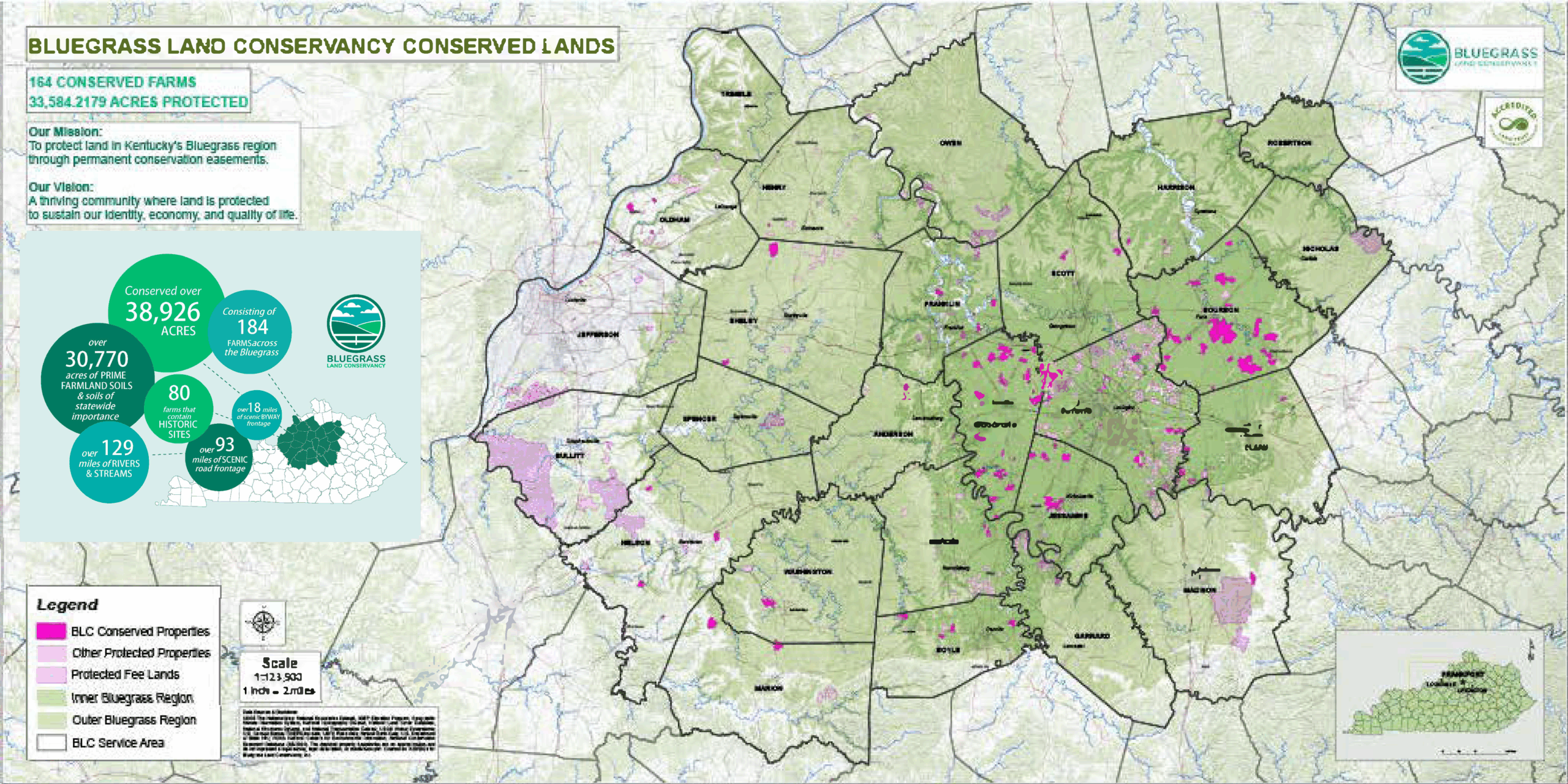 We work in 26 counties of the inner and outer Bluegrass region, where we focus on protecting agricultural land, natural habitats, and scenic open space – land that contributes to Kentucky’s economy and prestige, our natural shared space, and our cultural identity.