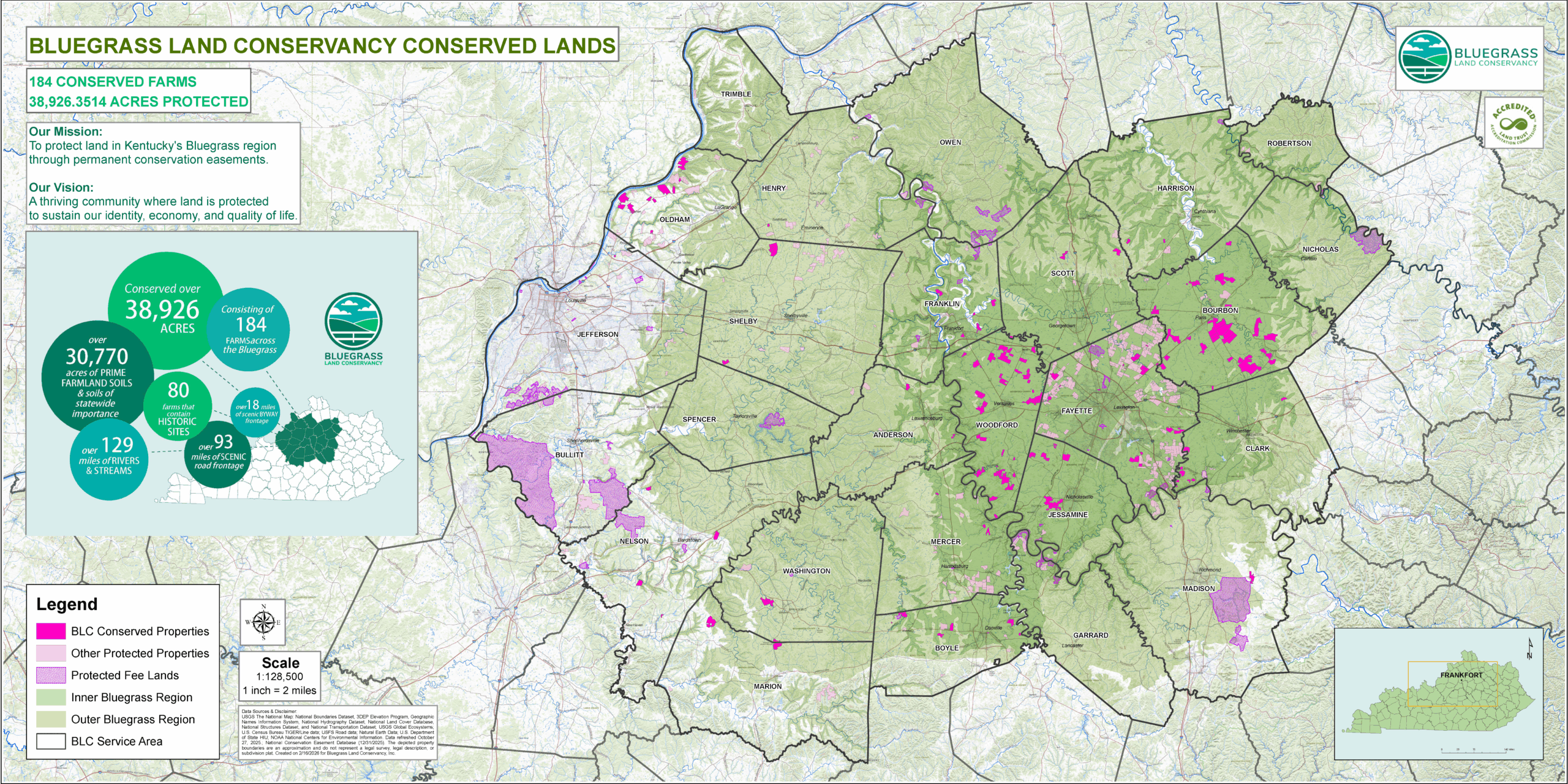 Natural Resource Conservation Service (NRCS) Regional Conservation Partnership Program (RCPP) achieves landscape-scale conservation by aiding landowners with funding conservation easements on Kentucky’s best natural and working lands in Anderson, Bullitt, Franklin, Henry, Jefferson, Jessamine, Mercer, Oldham, Scott, Shelby, Spencer, and Woodford counties.